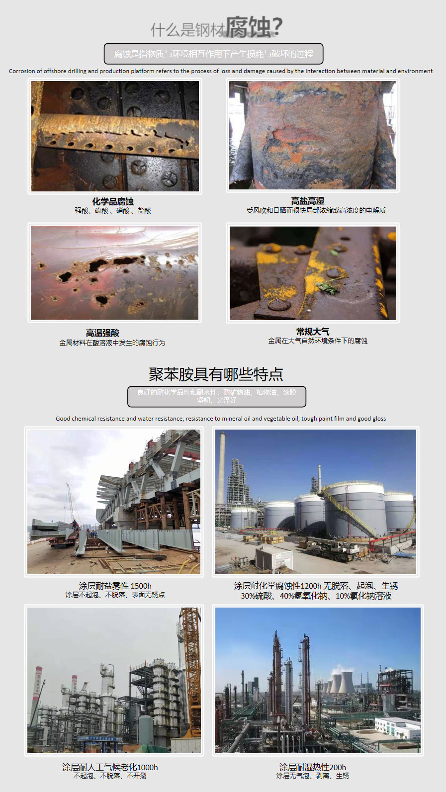 • 無溶劑環氧/聚氨酯體系,致密涂膜,耐酸、堿、鹽、油等化學介質。